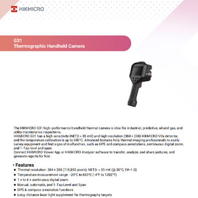 The HIKMICRO G31 high-performance handheld thermal camera is ideal for industrial, predictive, oil and gas, and utility maintenance inspections.