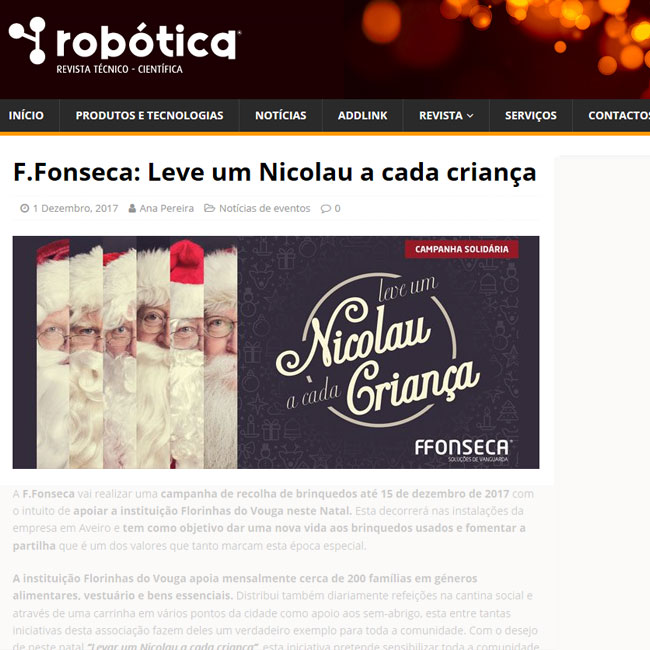 A F.Fonseca vai realizar uma campanha de recolha de brinquedos até 15 de dezembro de 2017 com o intuito de apoiar a instituição Florinhas do Vouga neste Natal. Esta decorrerá nas instalações da empresa em Aveiro e tem como objetivo dar uma nova vida aos brinquedos usados e fomentar a partilha que é um dos valores que tanto marcam esta época especial.