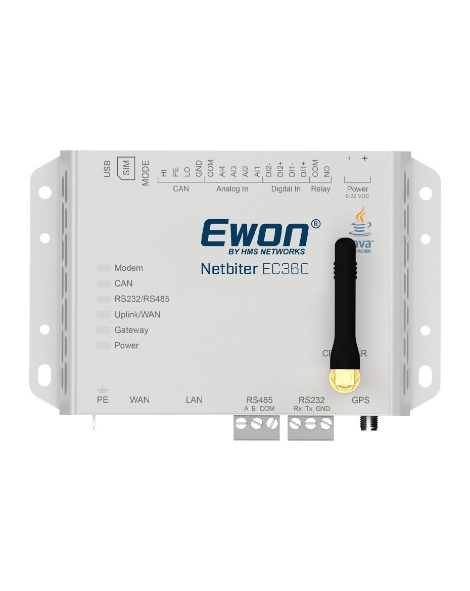 O Netbiter EC360 da Ewon, marca do grupo HMS Networks, é um gateway de comunicação industrial robusto, concebido para a monitorização remota, acesso e controlo de equipamentos no terreno a partir de qualquer local. Ligado através da rede 4G ou Ethernet à plataforma cloud IIoT Netbiter Argos™, o dispositivo permite gestão remota 24/7, transmissão segura de dados e acesso total ao estado, configuração e diagnóstico dos equipamentos.