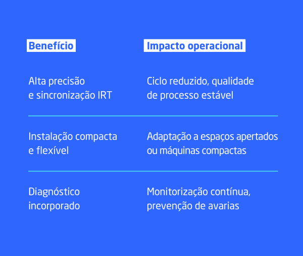 Um encoder absoluto com interface PROFINET, perfil de encoder versão 4.2 e que suporta a função IRT (Isochronous Real Time) é ideal para controlo de movimento sincronizado e ciclos curtos, garantindo que todos os dispositivos troquem dados exatamente no mesmo instante, a cada ciclo. |