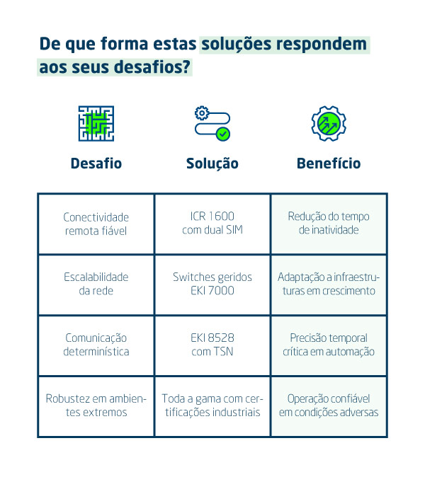 Seja para ligar remotamente equipamentos, reforçar a resiliência das comunicações ou garantir redes Ethernet geríveis e determinísticas, as soluções da Advantech respondem a desafios técnicos comuns na indústria.
