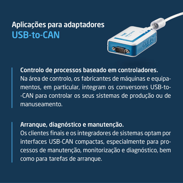 Os adaptadores Ixxat USB-to-CAN interligam dois mundos de dados: sistemas com redes de campo para CAN/CAN FD e LIN, e computadores com interface USB. Com estes adaptadores, as suas aplicações comunicam rapidamente e com segurança, mesmo em ambientes industriais exigentes. Os conversores USB-to-CAN oferecem várias opções de ligação e formatos para responder até aos requisitos mais complexos.
