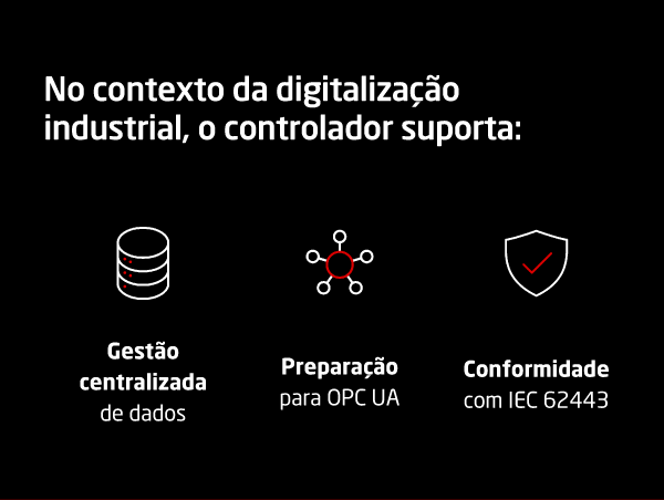 A comunicação CC-Link IE TSN (até 46 estações) permite sincronização determinística e elevada integração de dispositivos. |